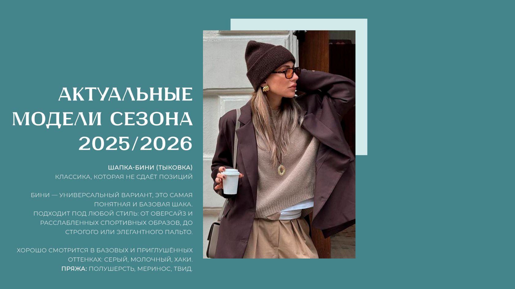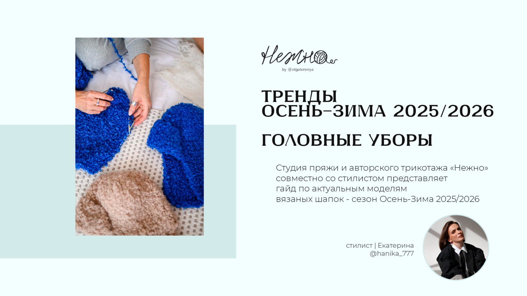 Магазин «Нежно» совместно со стилистом Екатериной (@hanika_777) подготовил гайд по самым актуальным моделям головных уборов сезона, а также рассказал, как связать модные вещи своими руками и правильно подобрать цвет пряжи под свой цветотип. Ведь сегодня быть в тренде — значит не только следовать моде, но и делать выбор осознанно, с любовью к себе и своему стилю.